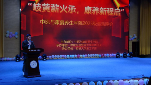 为增强康养学院2025级新生对校园文化的认同感和归属感,10月30日晚,中医与康复养生学院团总支在经开校区聚雅厅顺利举办了“岐黄薪火承,康养新程启”迎新晚会。本次活动由中医与康复养生学院主办,中医与康复养生学院团总支承办,雅悦大学生艺术团协办。雅安职业技术学院校团委书记郭庆,中医与康复养生学院直属党支部副书记魏奇峰,团总支书记赵武博、副书记栗景霞、李翔,辅导员许玉亭、杨芳、姚俊皓及300余名学生欢聚一堂。