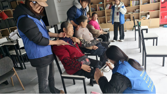 志愿者团队划分为四个专项服务小组:艾灸组为村民施灸,讲解原理与注意事项;推拿组提供专业按摩,缓解肩颈腰腿不适;血压组测量血压,结合生活习惯给予健康建议;宣讲组普及艾灸与康养知识,解答日常疑问。各小组协作有序,志愿者以专业的技术和耐心的态度完成各项服务,受到村民普遍好评。